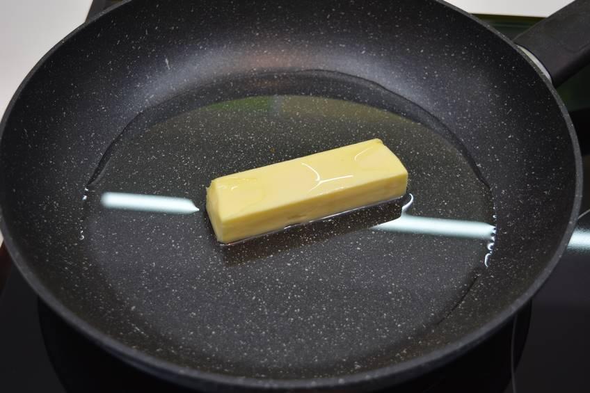 Paso 1 Comenzaremos a hacer este sándwich Montecristo poniendo un poco de aciete de oliva en una sartén junto a 75 gr. de mantequilla. Luego continuamos batiendo 4 huevos en un bol porque el sándwich Montecristo va rebozado.