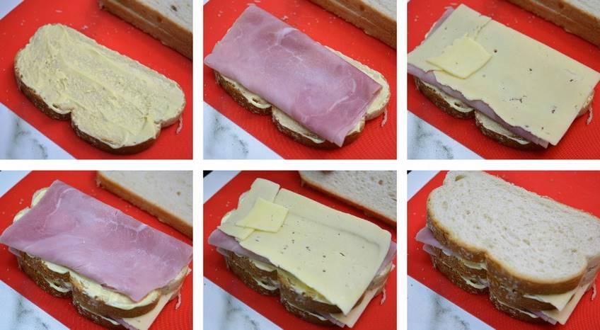Paso 2 Ahora hacemos una mezcla con mostaza y mayonesa para suavizarla, y nos disponemos a montar los sándwiches. Untamos la rebanada de pan que utilizaremos como base con la mezcla de mayonesa y mantequilla. Luego ponemos una loncha de jamón york y otra de queso. Ahora ponemos otra rebanada untada por la parte que quedará hacia arriba y repetimos la operación.
