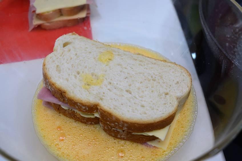 Paso 3 Continuamos con la elaboración empapando el sándwich con huevo, con cuidado de que no se nos desbarate todo, tiene que estar entero y bien empapado.
