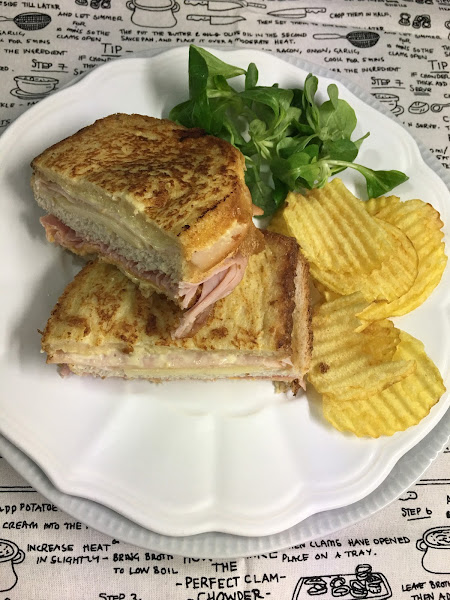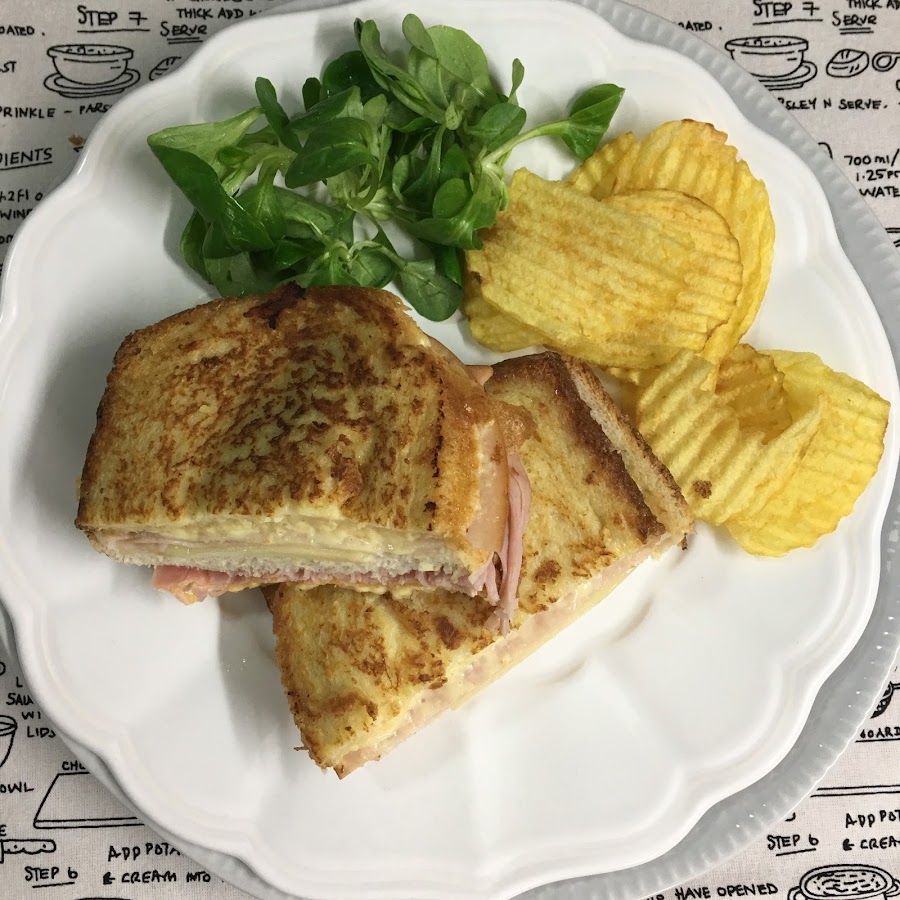Según parece, es una recreación del francés Croque Monsieur, aunque a mi me parece una mezcla de éste, con la French Toast y la portuguesa Francesinha. Realmente lo sirven con acompañamiento de sirope y azúcar glaçe, pero a mi me pareció un poco más bombazo de lo que realmente es y no se lo añadí.