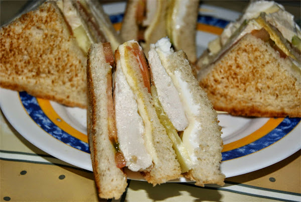 Cuando tengamos en pollo hecho pasaremos a preparar el sándwich. Para ello cogemos una rebanada y la untamos con la mostaza. Colocamos unas rodajas de pepino encima, unas de tomate y un filete de pollo. Coronamos con una loncha de queso y repetimos la operación pero en lugar de mostaza untamos mayonesa. Terminamos con una loncha de pan. Nos salen 4 sándwich.