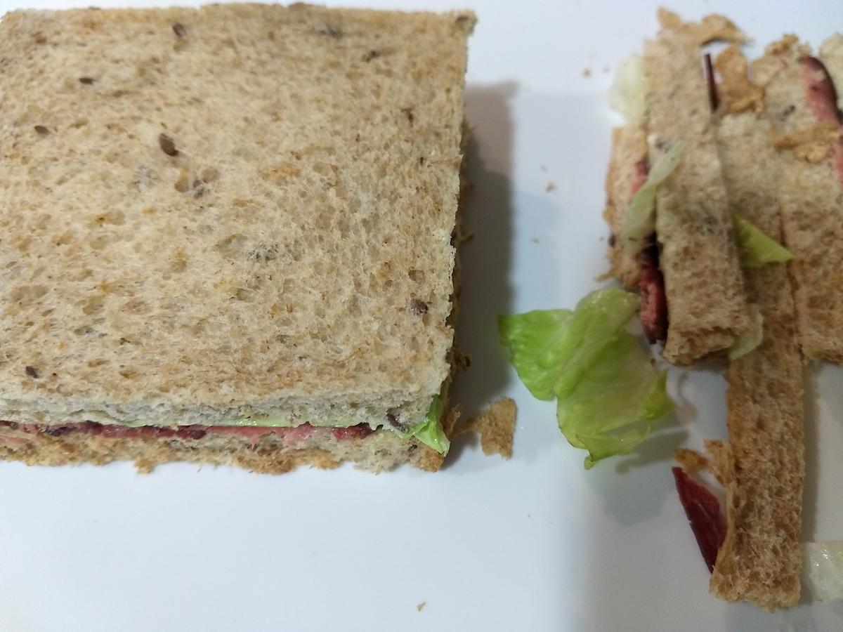 Lo tapamos con otra rebanada y recortamos los bordes para que nos quede un sándwich perfecto.