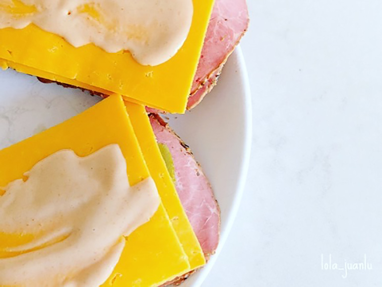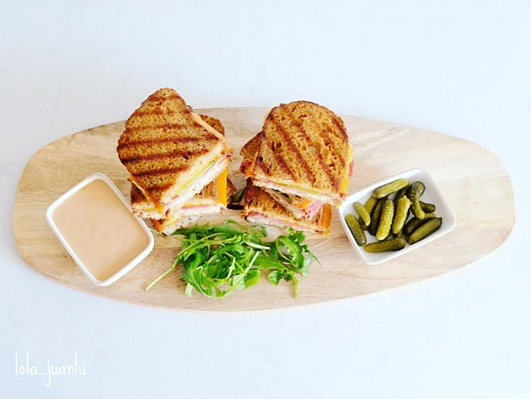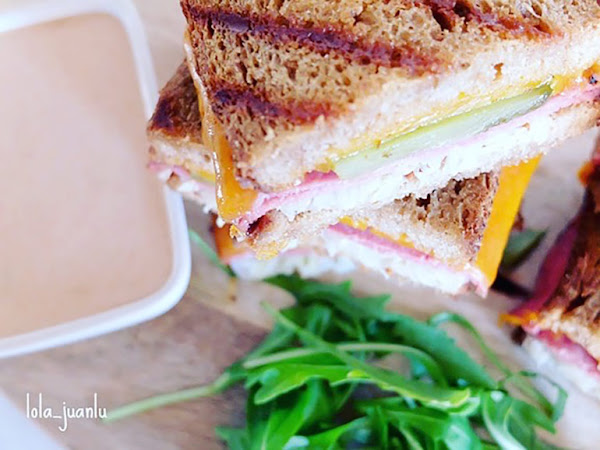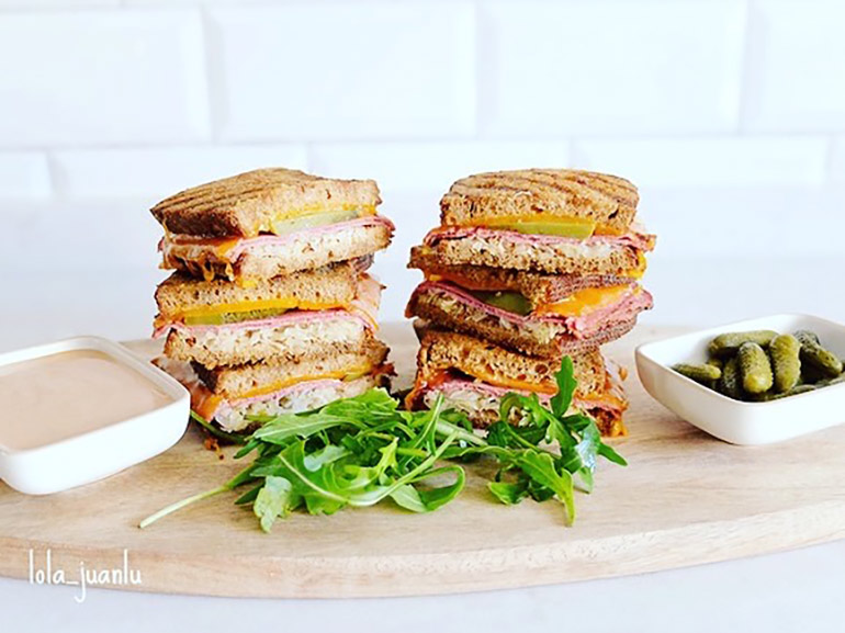 "El origen de este clásico de Nueva York no está claro, aunque muchos están convencidos de que se sirvió por primera vez en el restaurante Reubens Deli de la East 58th Street. Tradicionalmente se hace con carne de ternera cruda, queso suizo, chucrut y aliño ruso. Todo esto entre dos rebanadas de pan de molde de centeno. Nuestra versión está hecha con queso cheddar y pastrami, que se puede sustituir por jamón ahumado o simplemente no poner y hacer así una versión vegana."