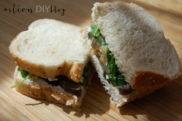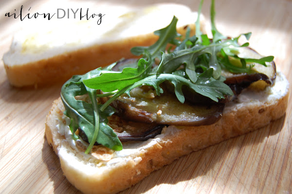 Solo hay que echar una chorradita de aceite en el pan, untar con la crema de queso azul, poner la berenjena y las hojas de rúcula.