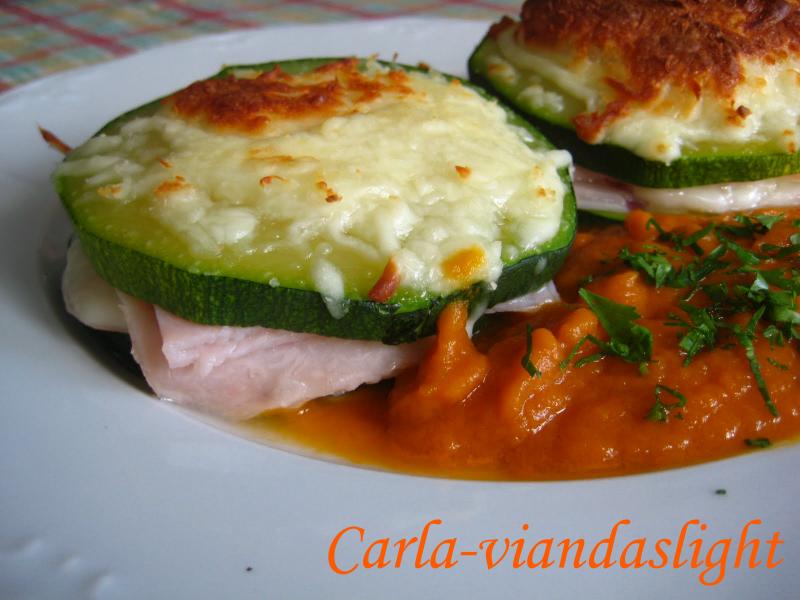 En una fuente para horno apenas pincelar con aceite para que no se te pegue el zucchini, luego colocarle una feta de queso y otra de jamón encimarle la otra rodaja de zucchinis y por encima colocarle el resto de queso mozarella o port salut light. Llevar al horno hasta que gratine.