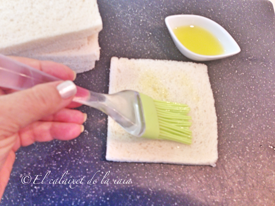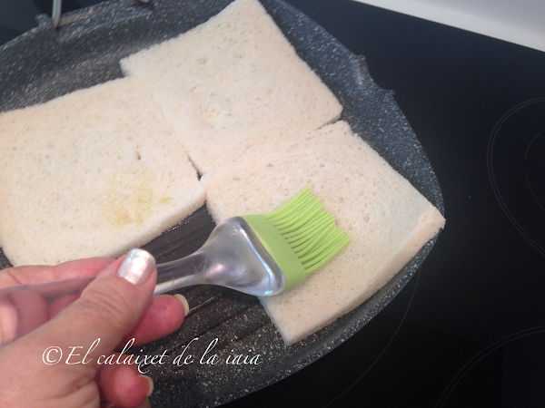 por la cara aceitada, ponemos el pan a tostar y aprovechamos para untar las caras que no lo están