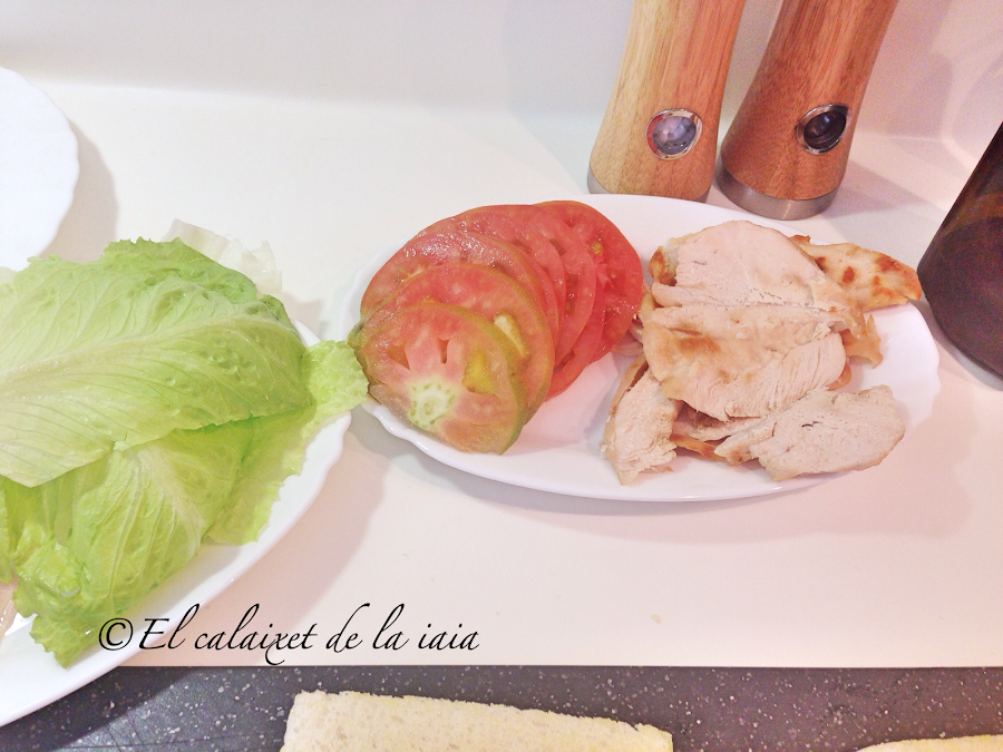 Mientras se tuestan, limpiamos y cortamos la lechuga y el tomate que haremos en rodajas finas