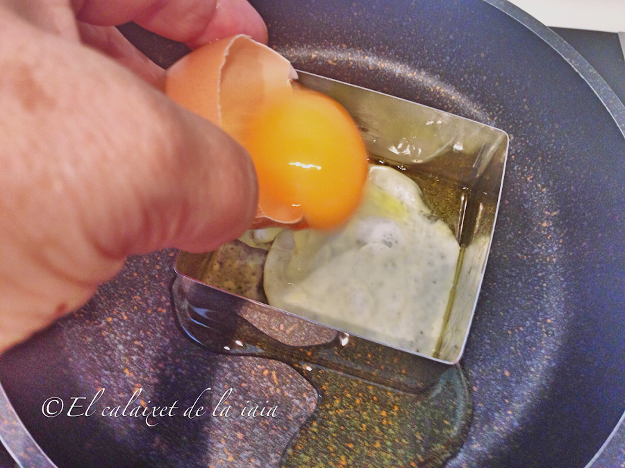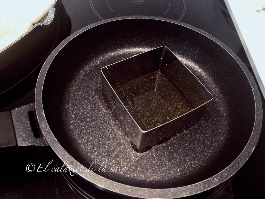 en una sartén pequeña, pondremos aceite de oliva, y en mi caso, un cortapastas cuadrado para dar forma al huevo pero pero ésto es opcional, porque el sabor será el mismo en redondo que en cuadrado, jeje