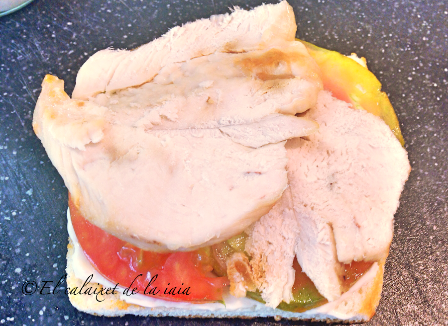 sobre el tomate, pondremos las lonchas de pollo asado. En mi caso, aprovecho restos de un pollo cocinado ayer al horno.