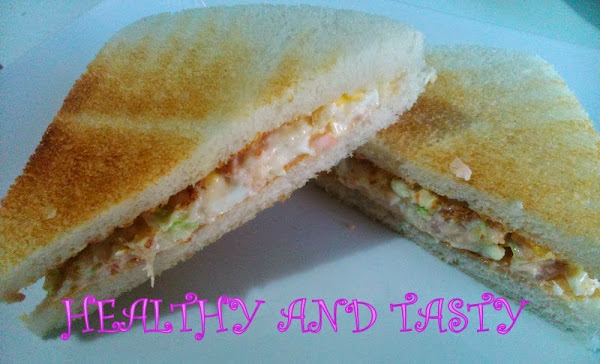 Picamos la lechuga muy finita y la mezclamos con el huevo duro picado, el atún escurrido, los palitos de cangrejo picaditos y la mayonesa. Lo mezclamos todo muy bien y rellenamos el pan de molde, previamente tostado en la tostadora.