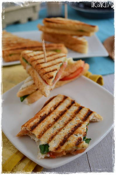 Untamos las rebanadas tostadas con la mayonesa por todas las caras menos por las exteriores, e intercalamos tomate, espinacas y el queso.