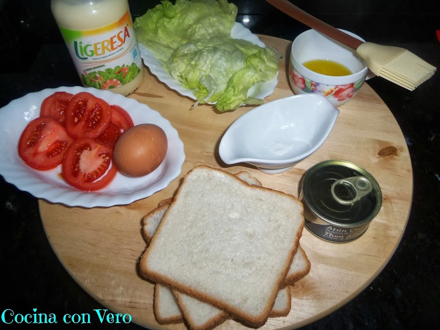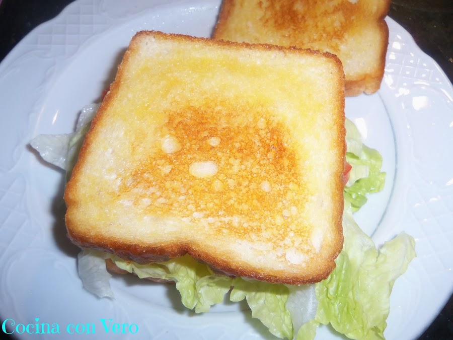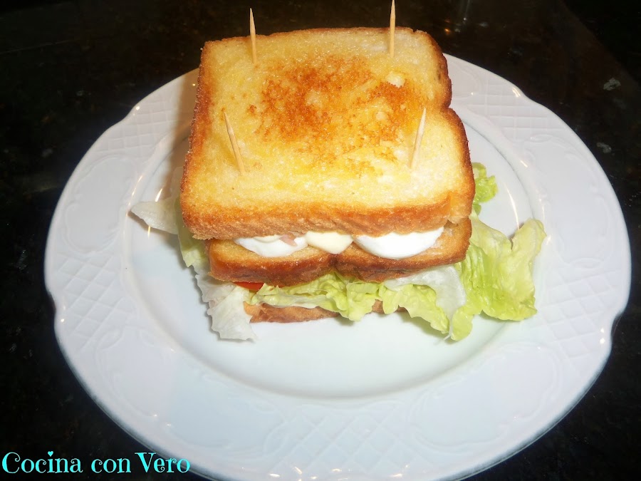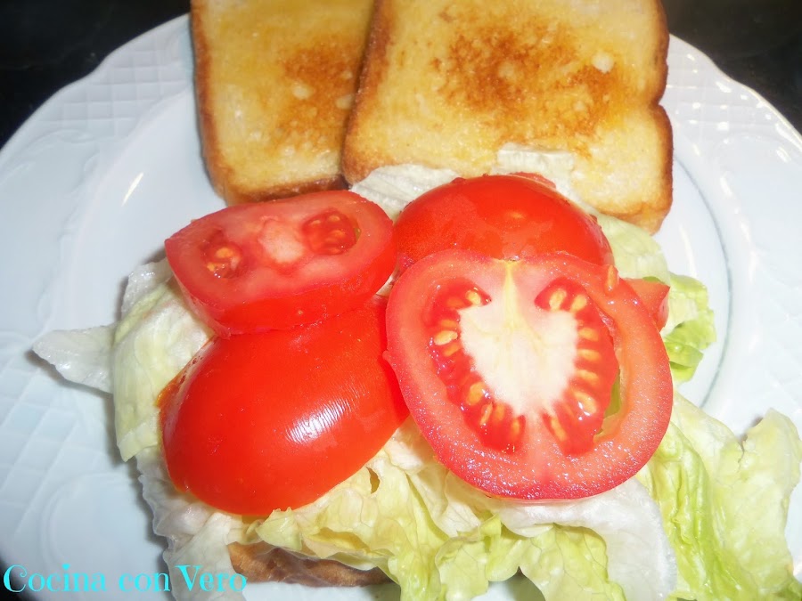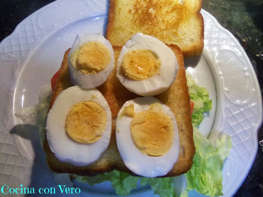 4/ En la primera rebanada donde teníamos la mahonesa repartida por todo el pan colocamos la lechuga, las rodajas de tomate, lo cerramos con una capa de pan por encima y añadimos las rodajas de huevo, el atún ó bonito y un poco de mahonesa para cerrar de nuevo el sandwich con la otra rebanada y finalmente degustarlo.