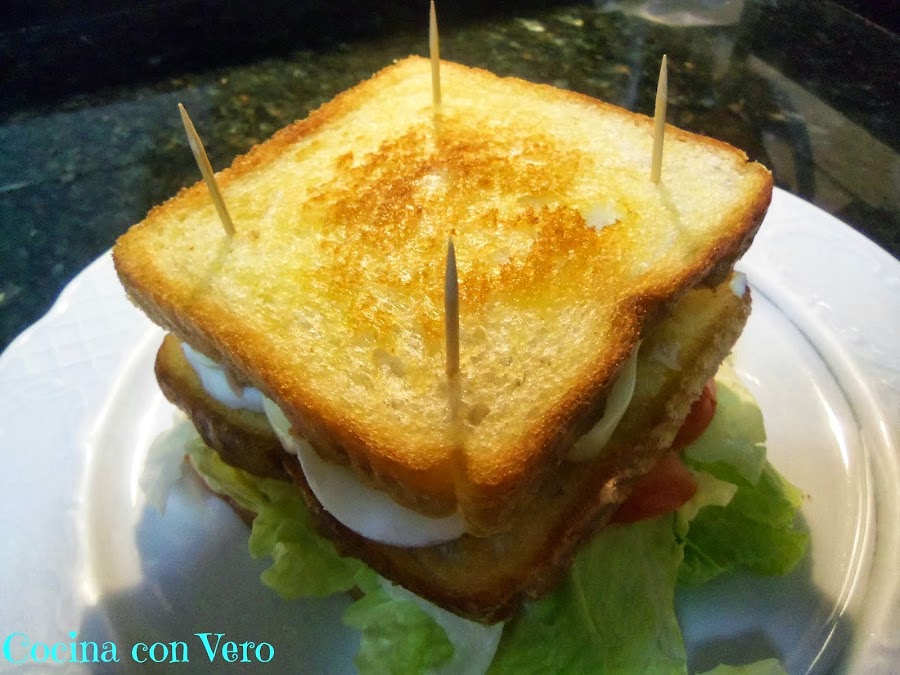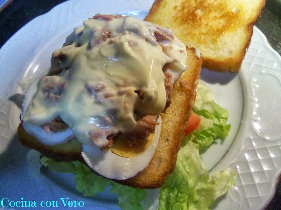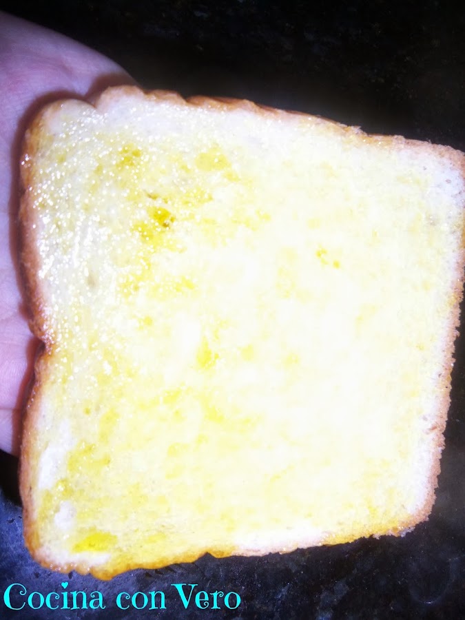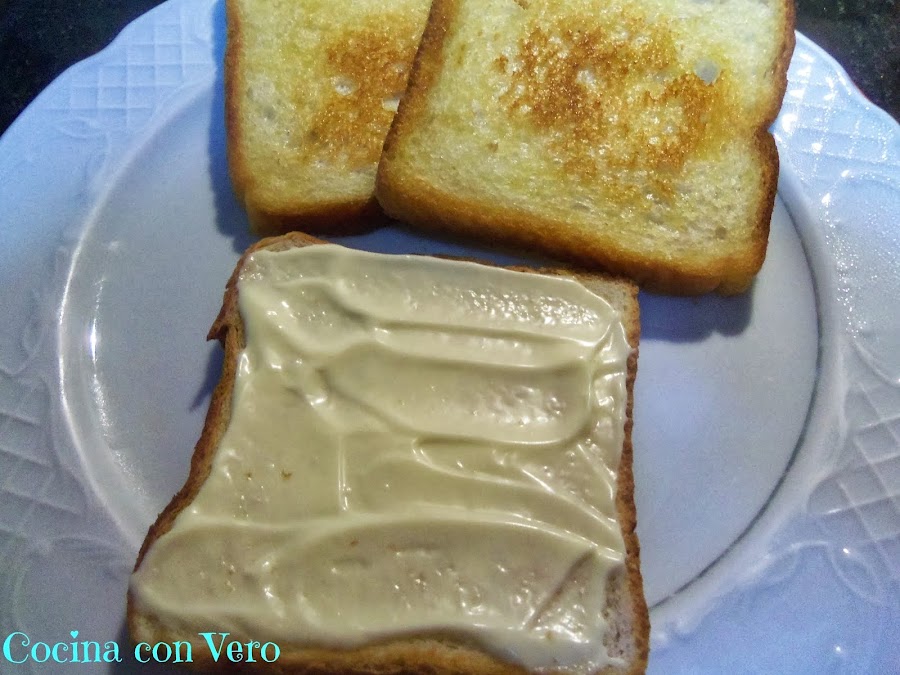 2/ Una vez doradas las rebanadas de pan las sacamos para un plato grande y en una de ellas por la parte que no esté dorado ponemos un poco de mahonesa repartido por todo el pan.