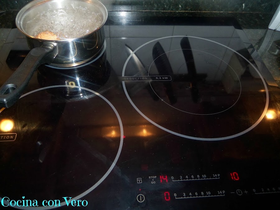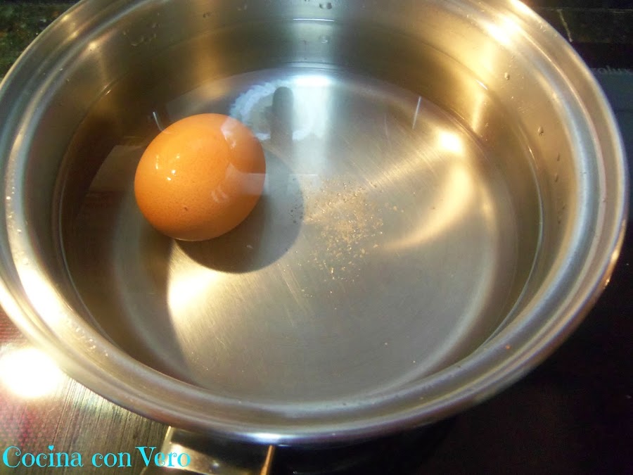 3/ En un cazo ponemos agua de modo que cubra el huevo y añadimos una pizca de sal para que se pele con mayor facilidad y no se nos rompa el huevo, esperamos a que salgan las burbujas y a partir de ahí contamos 10 min. y es cuando estará. Lo dejamos enfriar, le quitamos la cáscara y lo pasamos por debajo del grifo para quitarle restos de cáscara.