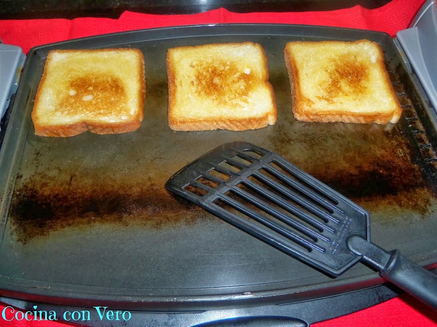 1/ Empezamos dorando el pan en la plancha untando una de las caras de los 3 panes con aceite con ayuda de una brocha de silicona y las ponemos en la plancha boca abajo en contacto con el aceite para dejarlas que se vayan dorando poco a poco, dándoles la vuelta con una espátula hasta que veamos que estén listas.