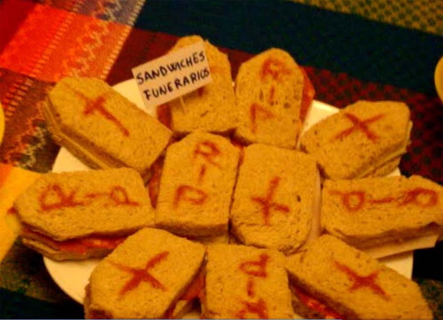 Elaboración: Se preparan los sanwiches con el relleno al gusto, se cortan por la mitad y quitamos las esquinas de un extremo con la intención de darle forma de "tumba". Con el ketchup decoramos para hacer un efecto más real. Muy sencillo, pero con un resultado espectacular!!