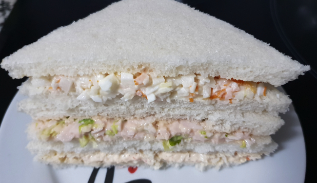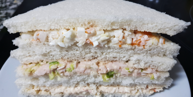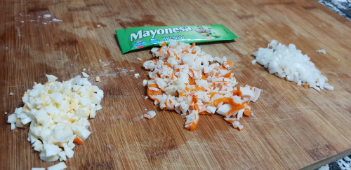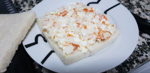 2-Sándwiches de cangrejo. Cuece un huevo durante 10 minutos en una cacerola con agua. Enfría, pela y pica en trocitos muy pequeños. Pica también los palitos de cangrejo en trocitos pequeños y mezcla con el huevo.