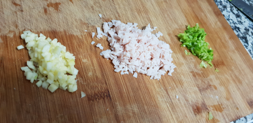3- Sándwiches de pavo con manzana. Pica el pavo en trocitos muy pequeños, pela y pica también la manzana mezclándola con el pavo. Lava, seca y retira el tronco de la lechuga. Pica fina y mezcla con el pavo y la manzana.