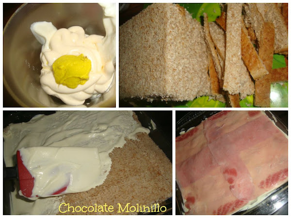 Para armar el sandwichón, se colocan rebanadas suficientes para cubrir el fondo del refractario, pero deben estar ya sin las orillas, le untamos queso batido, y cubrimos con el jamón, aquí es en donde en cada capa, se añaden las rebanadas de queso amarillo, unas tiritas de pimiento morrón, las aceitunas, los chiles en vinagre, elotitos de lata, en fin, lo que se les antoje, yo lo preparé muy básico, pues sólo es la salsa de queso crema batida, el jamón y los chiles en vinagre, pero pueden prepararlo también con atún, o paté de hígado, o bien, licuar el jamón junto con los demás ingredientes y esto untarlo a los panes, formando varias capas, de ahí la versatilidad de este platillo.