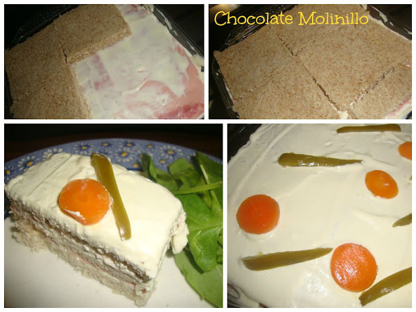 Debemos formar un pastel en capas, pues al terminar cada capa, agregamos otra de panes y volvemos a empezar con lo demás, sólo no olvidemos colocarle un poco de queso crema batido antes de la otra capa de pan, así no quedará tan reseco el sandwichón. Yo lo hice con tres capas de pan, pero debes terminar con una capa de queso batido y adornas con chiles en vinagre o con pimientos morrones, o aceitunas, queda lindo, fresco y delicioso. Tapamos, y refrigeramos, por lo menos 1 hora antes de servir, así tomará consistencia y será más fácil servirlo y cortarlo.