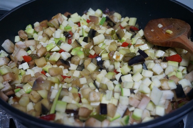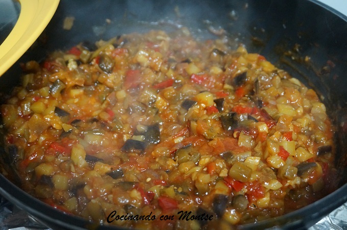 Cuando las verduras estén un poco transparentes añadiremos los calabacines y la berenjena. Ponemos un poco de sal y lo dejamos cocinar 5 minutos.