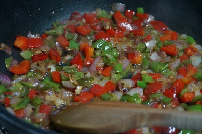 Lavamos las verduras, cortamos en trozos la cebolla, el pimiento verde y pimiento rojo.