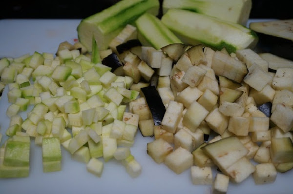 Por otro lado picamos los calabacines y la berenjena.