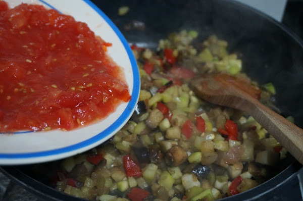 Lo dejamos se vaya cocinando todo junto. Si hiciera falta añadiremos un poco más de aceite. Mientras vamos pelando los tomates, los picamos, lo añadimos junto a las verduras. Removemos todo.