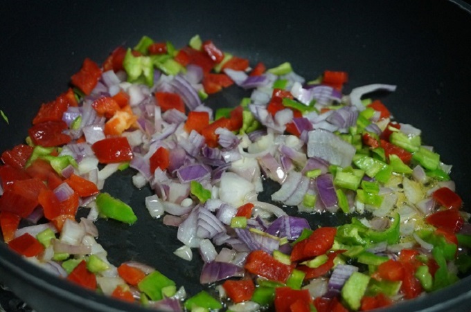 Ponemos una sartén con un buen chorro de aceite y añadimos las verduras picadas. Las dejamos se vayan sofriendo.