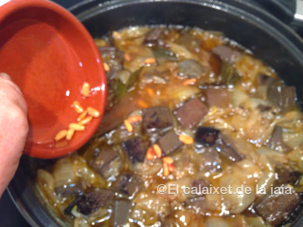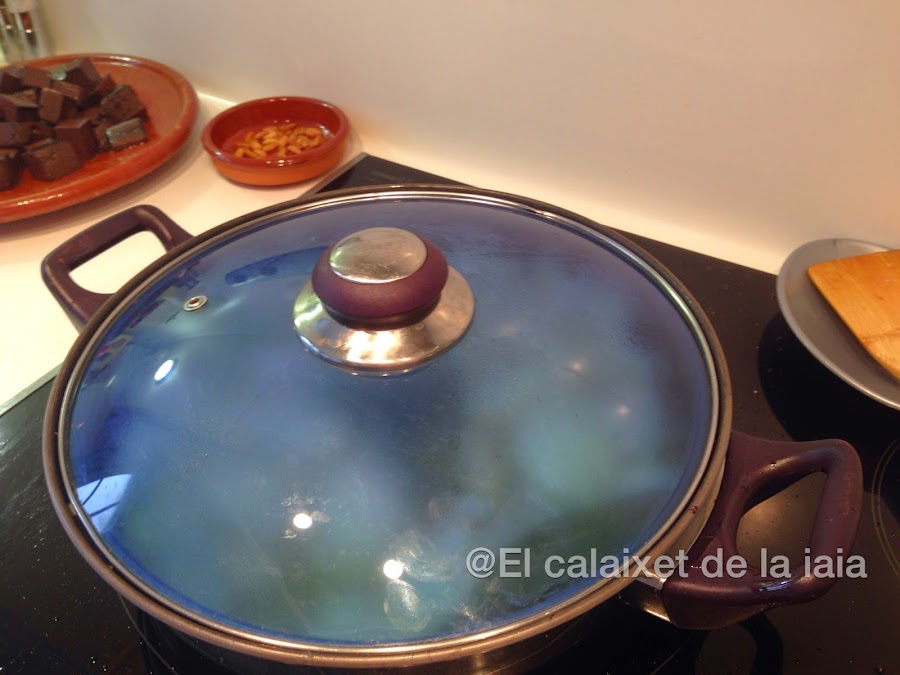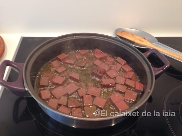 ponemos la sangre a freir en el aceite de haber dorado los piñones, damos unas vueltas y reservamos