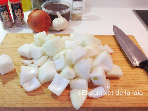 Comenzaremos pelando y troceando las cebollas, aunque os parezcan muchas un kilo, pensad que luego de pochadas quedan en casi nada