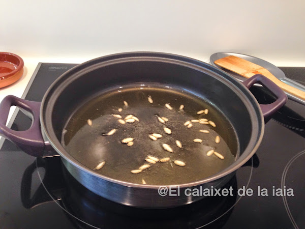 Ponemos el aceite de oliva a calentar en el que doraremos un puñadito de piñones y reservaremos
