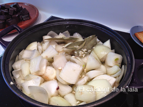 ponemos a pochar la cebolla en el mismo aceite junto a los hojas de laurel enjuagada y el diente de ajo picadito