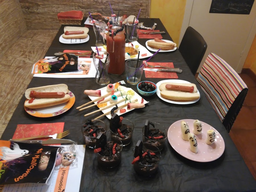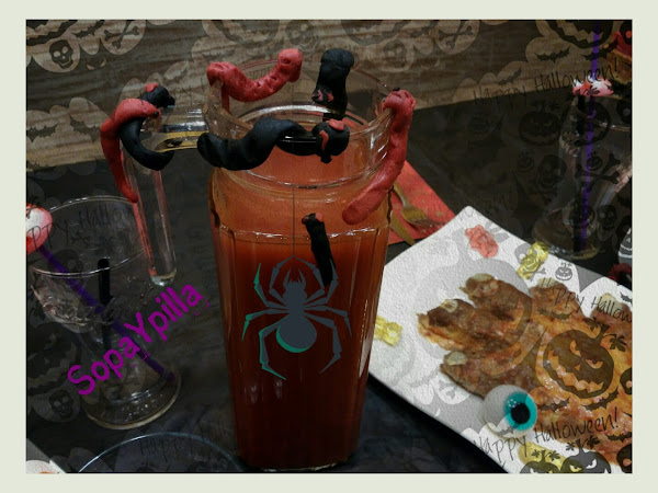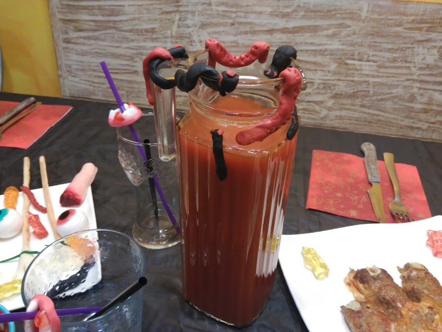 La bebida también cuenta, se hace en un plis y les encanta. Normalmente les ponía limonada y la teñía con algún colorante, pero cada vez abuso menos (o nada) de los colorantes alimentarios. Es muy parecido al Bloody Mary, pero con limonada y sin alcohol.