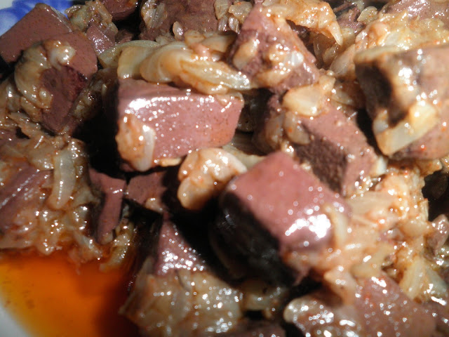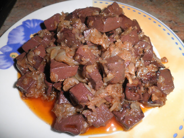 Cortamos la cebolla muy finita y la ponemos a pochar a fuego lento. Mientras tanto, cortamos la sangre a cuadraditos y, cuando estén, los ponemos a pochar junto con la cebolla.