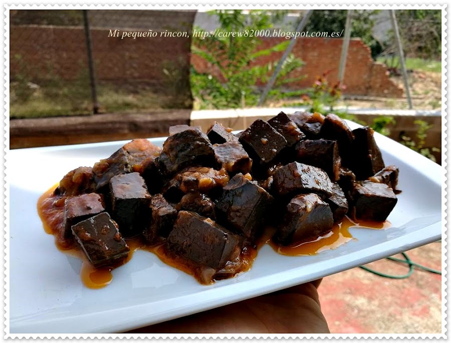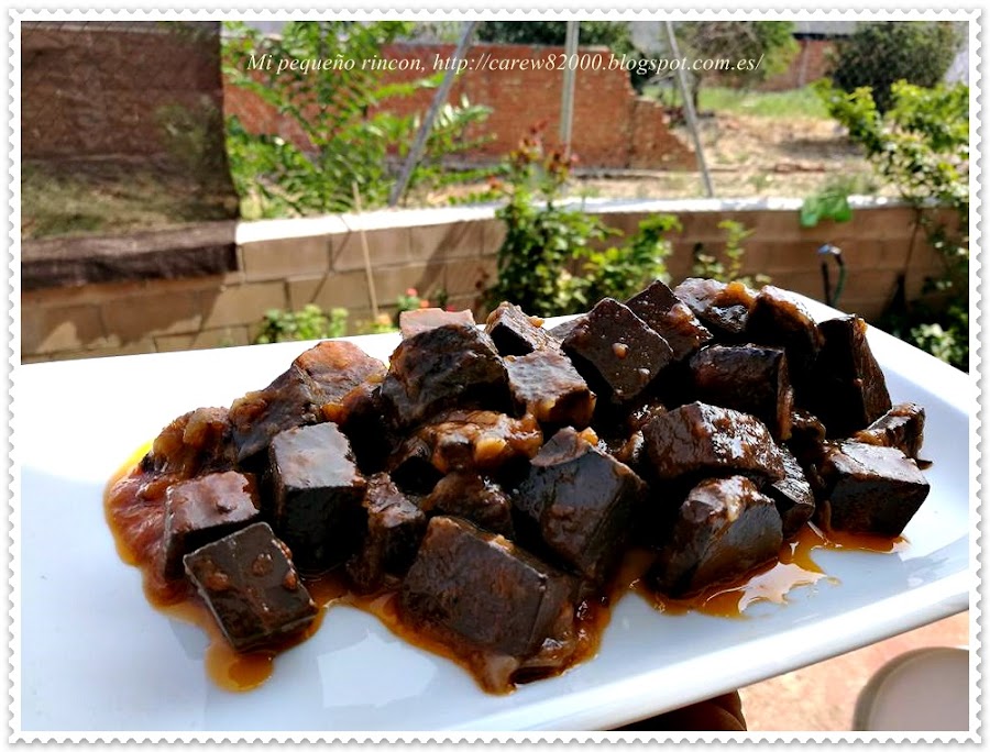 En otra sartén mas grande echamos una pizca de aceite de oliva y refreímos un poco la sangre, simplemente para que coja un poco de color hay que tener en cuenta que ya viene cocida.