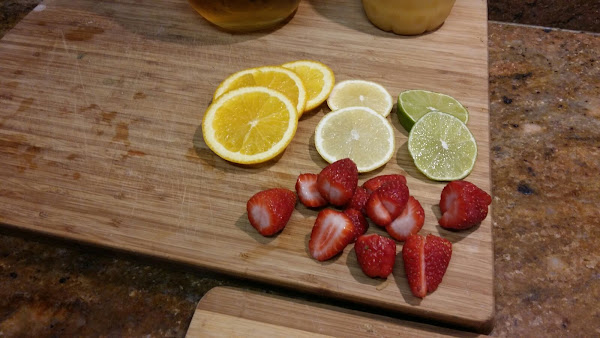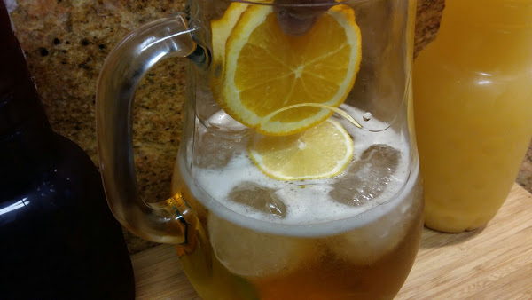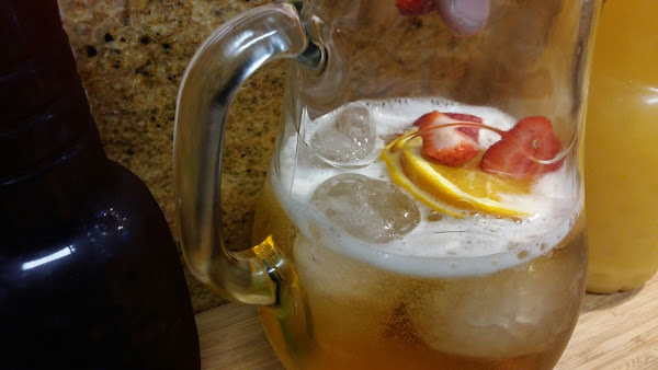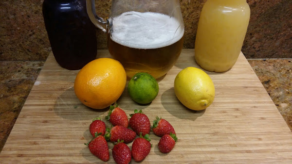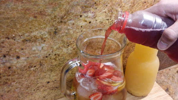 3 latas de cerveza, 100 ml de zumo de arándanos, 100 ml de zumo de piña, 2 rodajas de naranja, 2 rodajas de limón, 2 rodajas de lima, un puñado de fresas, un chorrito de ron (opcional)