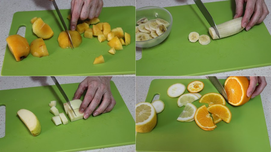 Lavamos, pelamos y picamos el plátano, la manzana y el melocotón . Lavamos y picamos en medias rodajas el otro limón y la otra naranja