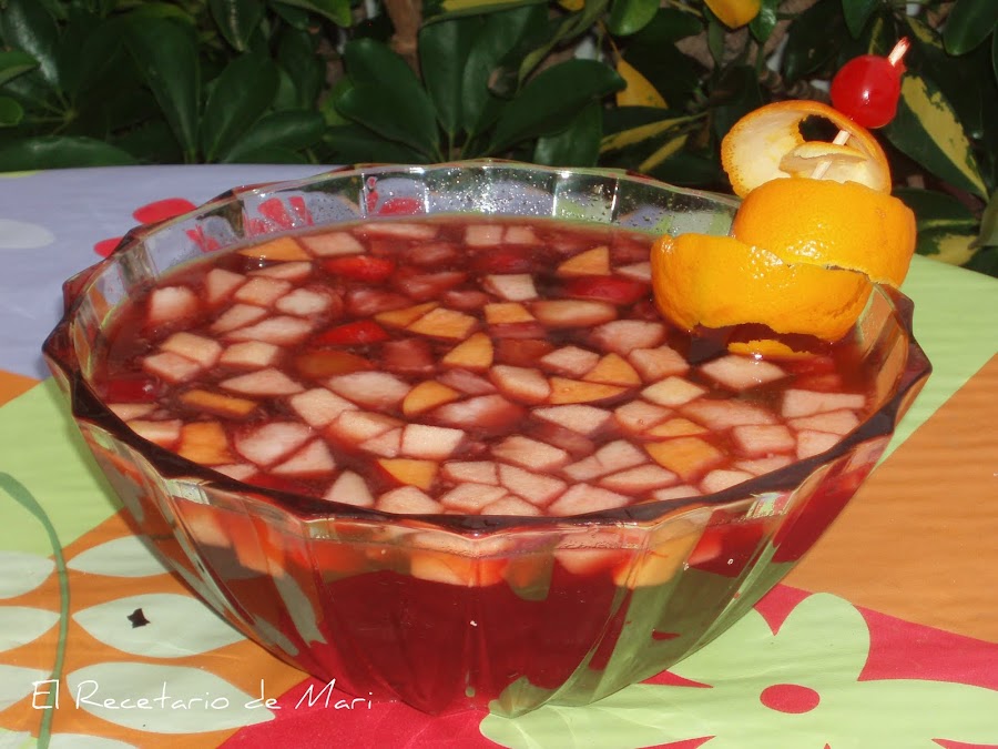Existen muchísimas recetas para hacer Sangría, hay quien le pone más de una cosa que de otra, pero siempre manteniendo sus ingredientes principales: EL VINO y LA FRUTA. Yo les pondré la forma que durante muchos años la hemos elaborado en casa.