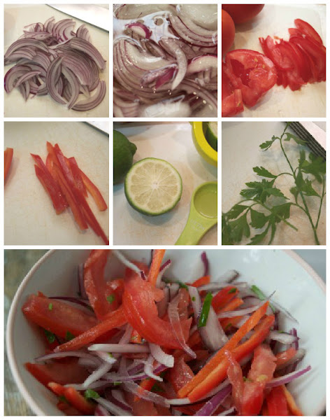 Picamos en juliana la cebolla roja, el tomate sin centro ni semillas y el pimiento, sin pepitas ni nervaduras interiores.