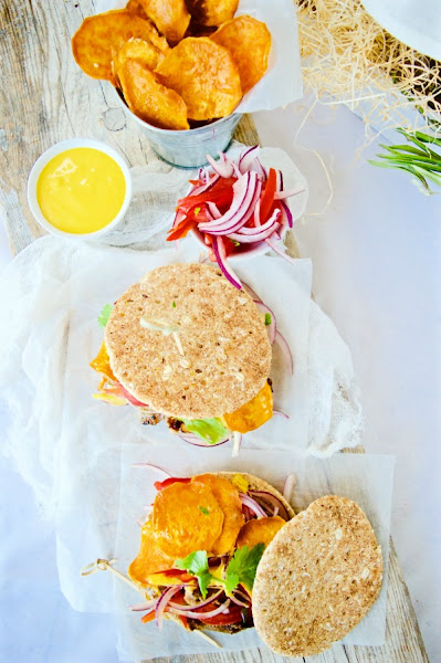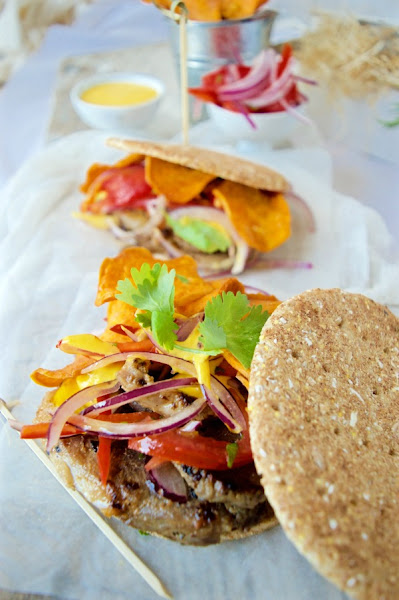 Para el montaje del sandwich, cogeremos los panes Thins y como ya están abiertos, pues los separamos. Colocamos la base en un plato y ponemos una chuleta encima, un poco de salsa criolla y un poco de salsa de ají, le colocamos unas cuantas de batatas (en Perú le dicen "camote"), ponemos otra chuleta encima, volvemos a colocarle más salsa criolla y si os gusta el picante, pues más salsa de ají; unos cuantos camotes más y tapamos.