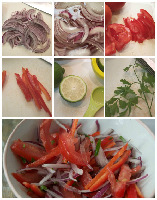 En otro bol, echamos el pimiento y el tomate, el zumo de lima, el aceite, el cilantro, un poco de sal y pimienta y la cebolla muy bien escurrida. Removemos bien y reservamos.