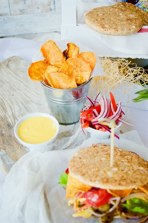 Preparamos ahora la batata, cortándola en láminas finitas. Las espolvoreamos con un poco de Maicena y las freímos en aceite caliente como si fueran patatas fritas. (Cuidado porque se hacen antes que las patatas y se ponen marrones en vez de naranjas). Si preferís, podéis hacerlas al horno), unos 10-15 minutos a 180ºC.
