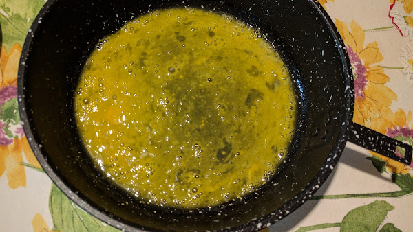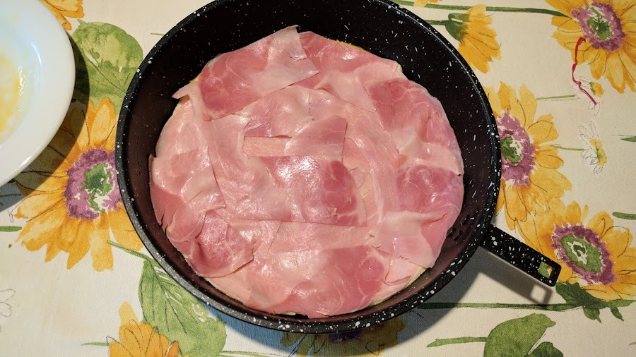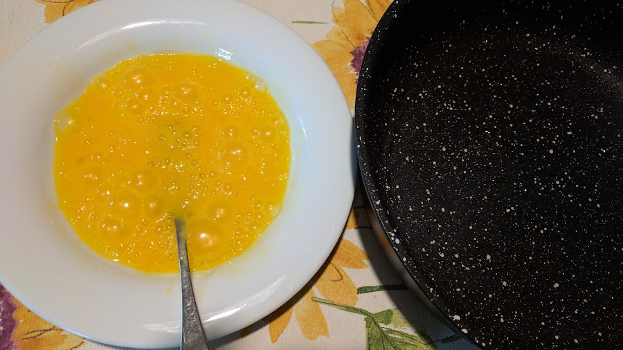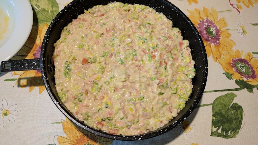 Para la base hay que batir 2 huevos XL o 3 medianos (salpimentamos) Por encima, al poner la última capa se hace lo mismo. Recuerda untar bien base y paredes con AOVE.