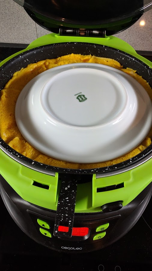 Para hornearlo he puesto función manual, 175 grados, durante 15 minutos. Hay que estar atentos pues se empieza a dorar en exceso por arriba. Para que eso no pase recorta papel de hornear del tamaño de un plato de postre. Pones en el centro del sándwich y el plato encima para que no se mueva. Tiene que ser resistente al calor, por ejemplo de porcelana. Así el cocinado será el correcto por funcionar el aire del cabezal. También puedes utilizar papel de aluminio resistente al horno. Al acabar el tiempo quita el plato con un guante de silicona y programa menú tostada hasta que veas dorada la superficie.