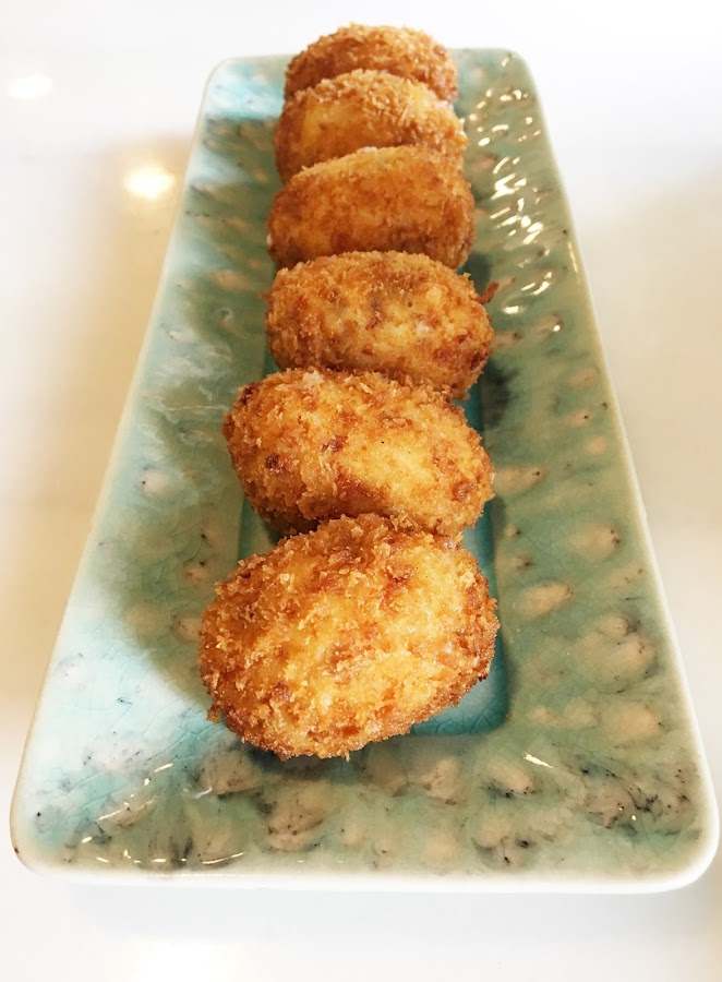 La ración trae 6 uds y cuesta 10€, pero si prefieres puedes pedirlas por unidades (2€/una) y la verdad es que tienen merecidísimo el premio. Son unas de las croquetas más ricas que hemos probado, con una bechamel finísima, cremosa y muy ligera, con tiene mucho relleno de jamón. Por fuera son muy crujientes debido a que el rebozado se ha hecho con panko (derivado del pan rallado que hace que las frituras queden así), por lo que en conjunto hacen de cada croqueta un bocado delicioso.