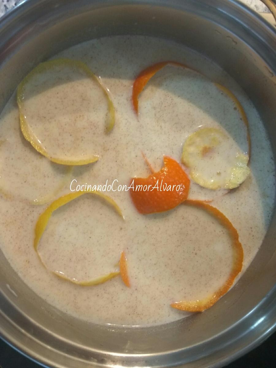 Teniendo todos fritos, la leche que hemos aromatizado, les quitamos las cáscaras de limón y naranja. Y las ramas de canela.