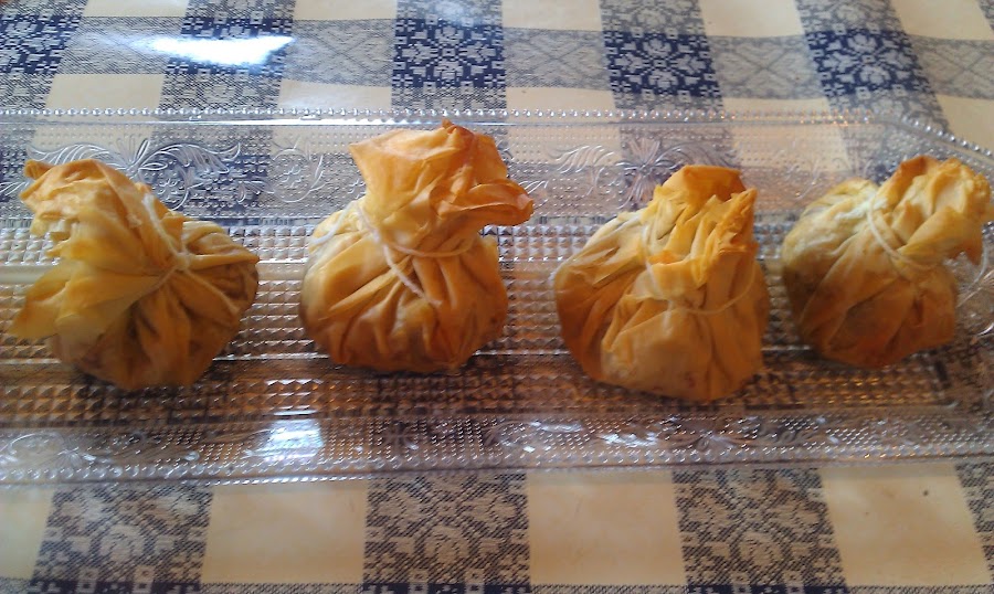 Cortar cada lámina de pasta en dos y poner dos capas de esa pasta bric para que no se rompa el saquito al hacer en sartén o en el horno, en el centro echar unos dados de plátano y unos dados de bacon, cerrar las hojas de bric haciendo un saquito que se puede cerrar con hilo de cocina o con una ramita de cebollino. Yo para hornear los cierro con hilo de cocina y al sacarlos del horno se lo corto y los ato con cebollino, pero solo por estética.