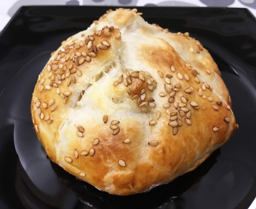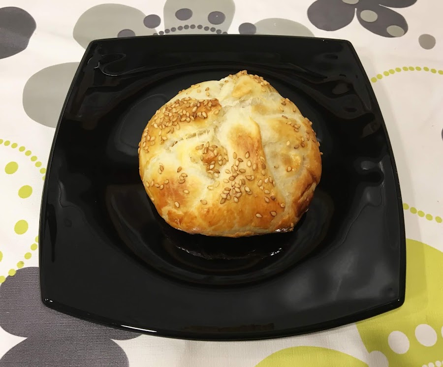 - Pinta el hojaldre con huevo batido y espolvorea semillas de sésamo por encima.