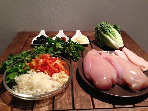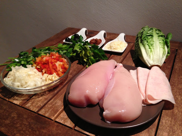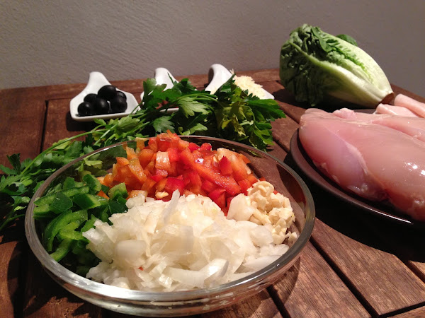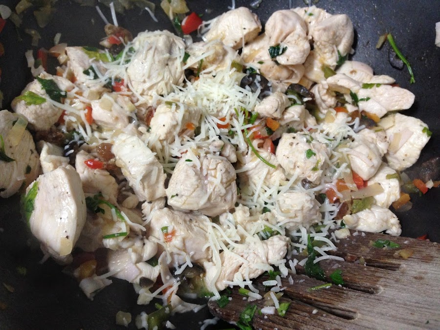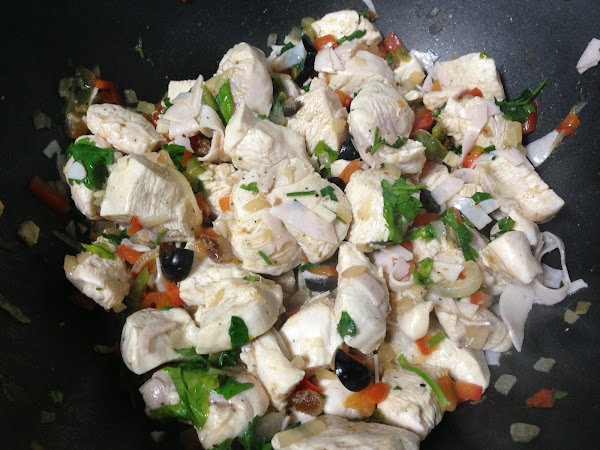 Mientras el pollo se va haciendo con el pimiento y cebolla picaremos unas ramas de perejil y se las añadiremos. Incorporaremos igualmente las pasas y podemos picar las aceitunas negras e integrarlas al wok. Igualmente picamos las tres lonchas de pechuga de pavo y las añadimos al resto. Vamos removiendo todo hasta que veamos que el pollo está hecho, sin pasarnos para que no quede demasiado seco.